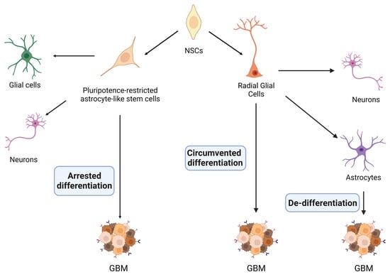 In a developing Central Nervous System (CNS), NSCs are ubiquitous and responsible for the formation of the three main nerve tissue cell types []. NSCs progressively restrict their cell plasticity, giving rise to intermediate progenitor cells that can ultimately differentiate into mature neurons or glial cells (Figure 1). A subset of NSCs and lineage-restricted progenitor cells continue to reside in restricted regions of the postnatal and adult brain: the subventricular zone (SVZ) of the lateral ventricle and the subgranular zone (SGZ) of the dentate gyrus (DG) in the hippocampus [,]. The human SVZ consists of three anatomically distinct layers: the ependymal layer, hypocellular gap, and astrocytic ribbon []. The latter one contains glial fibrillary acid protein (GFAP)-positive cells and astrocyte-like stem cells with a restricted self-renewal potential, compared to NSCs, whose fate and terminal differentiation are rapidly achieved [,]. It has been hypothesized that during the earliest stages of gliomagenesis, the occurrence of a mutation on TERT (Telomerase Reverse Transcriptase) promoter triggers high grade malignant transformation in lineage-restricted astrocyte-like stem cells from the astrocytic ribbon layer []. Subsequently, several other somatic mutations occur and accumulate []. It has been shown that the occurrence of the most common alterations in deregulated oncogenes in GBM (EGFR, PTEN, TP53, NF1) allows mutated progenitor cells to migrate from SVZ to the cortex, leading to the growth of a tumor [,].