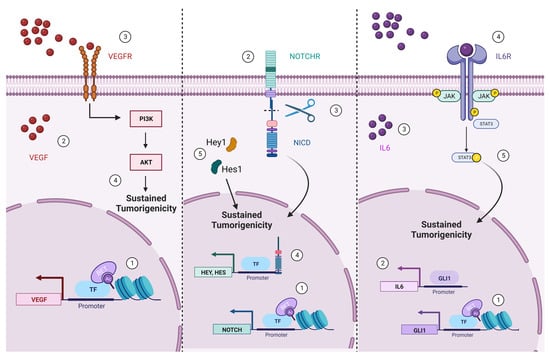 PI3K/AKT signaling pathway is frequently dysregulated in GBM cells, due to alterations in several signaling proteins. Two well-known GBM hallmarks are RTK amplification and phosphatase and tensin homolog (PTEN) loss of function or abnormal activation, which are an upstream and downstream component of PIK3/AKT axis, respectively []. Over the last few decades, hyper-activation of PI3K/AKT signaling pathway in malignant brain tumors, including GBM, has been frequently related to genetic and epigenetic alterations. Indeed, the role of BRD4 in PI3K/AKT signaling pathway [] and its overexpression in GBM suggest a functional relationship. BRD4 silencing or pharmacological inhibition by JQ1 treatment seems to limit the stemness of murine GSCs and their cellular plasticity by decreasing the NSC marker Nestin and the ciliary neurotrophic factor. BRD4 inhibition impairs cell proliferation, induces apoptotic death by favoring DNA damage, and allows murine GSC to differentiate into astrocytes []. The main mechanism by which BET inhibition mediates these effects is through down-regulation of VEGF/PI3K/AKT pathway. BRD4 is known to regulate the key GSCs oncogenic properties by promoting VEGF expression; therefore, its knocking-down or inhibition reduces VEGF transcription and VEGFR activation and switches off all the downstream signaling pathways [] (Figure 3).