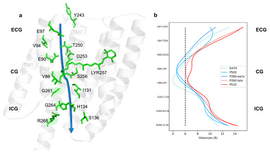 - Yang, T.; Zhang, W.; Cheng, J.; Nie, Y.; Xin, Q.; Yuan, S.; Dou, Y. Formation Mechanism of Ion Channel in Channelrhodopsin-2: Molecular Dynamics Simulation and Steering Molecular Dynamics Simulations. Int. J. Mol. Sci. 2019, 20, 3780. [Google Scholar] [CrossRef]