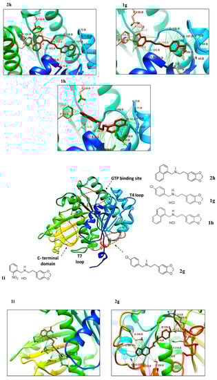 | 2h | 2 Thr132, Pro134 | 5 Ala70, Ala72, Gly106, Gly107, Thr108 | 1 Phe 182 | −7.45 | |