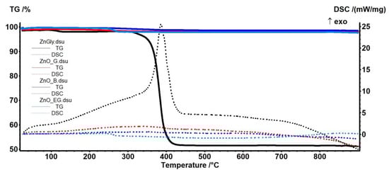 However, the TG-DSC analysis of ZnO_G sample obtained after boiling the ZnGly in water indicates the successful synthesis of ZnO, as the residual mass is 98.09%. The ZnO_G sample is slowly losing 1.19% of its mass up to 200 °C, indicating a higher concentration of water/hydroxyl moieties on the ZnO nanoparticles surface. After 200 °C the slow mass loss continues up to ~350 °C, amounting to 0.72%, with the process being accompanied by an exothermic effect at 341.5 °C, indicating the oxidation of organic impurities. TG/DSC analyses for individual ZnO_B, ZnO_EG, and ZnO_G samples are presented in Figure S3a–c.