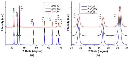 The X-ray diffractograms for: (a) ZnO_B, ZnO_EG and ZnO_G samples; (b) detail for the 2θ = 31–37° interval.