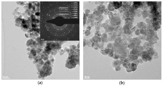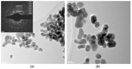 For the sample ZnO_EG the NPs have rather a rounded shape with no agglomeration tendency (Figure 4). The size of the nanoparticles is larger than that for the ZnO_B sample, with the NPs size distribution (Figure S4b) indicating a value of 44.24 nm, in accordance with XRD calculation. These nanoparticles are also monocrystalline, as their size matches the previous calculated value for the crystallite size. The SAED image (inset of Figure 4a) confirms the presence of crystalline ZnO, while the HRTEM image (Figure 4d) permits the determination of the interplanar distance of 0.259 nm corresponding to Miller indices (0 0 2).