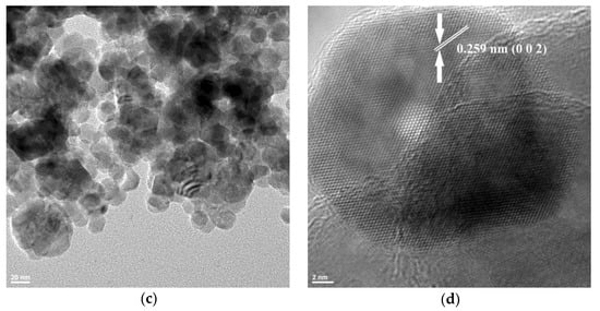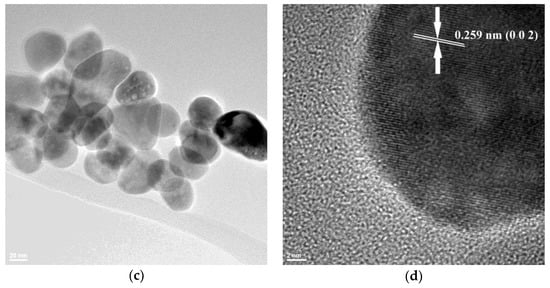 The TEM images for ZnO_G samples (a) 29,500× magnification; (b) 39,000× magnification; (c) 49,000× magnification; (d) high resolution TEM and identified planes of hexagonal ZnO (JCPDS card no. 80-0075).