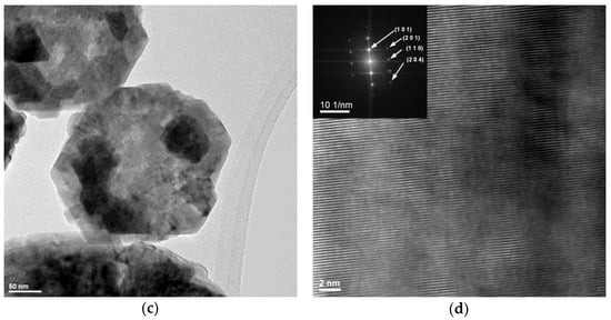 For the ZnO_G sample, due to differences in the synthesis process, the morphology is very different from the previous samples (Figure 5). The particles are large, often over 100 nm, hexagonal, with some agglomeration tendency, and no amorphous phase. The particles size distribution (Figure S4c) indicates a value of 120.15 nm. A closer look at the hexagonal particles will reveal that they are composed from many smaller polyhedral crystallites, as shown in Figure 5c. Therefore, these hexagonal particles can be considered polycrystalline. The HRTEM image (Figure 5d) shows clear lattice fringes in a regular succession of the atomic planes, indicating uniformity of the structure.
