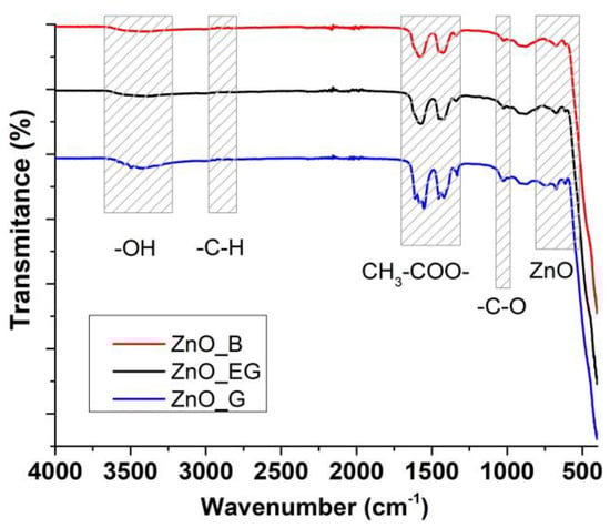 The FTIR spectra for ZnO_B, ZnO_EG and ZnO_G samples.