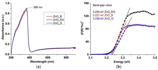 The UV-Vis spectra for ZnO_B, ZnO_EG and ZnO_G samples (a); the band-gap energy values (b).