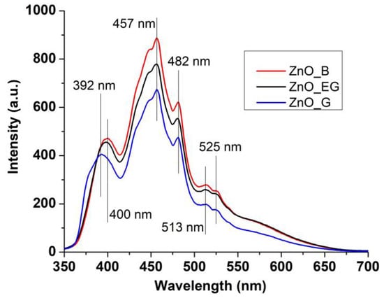 The emission spectra for ZnO_B, ZnO_EG and ZnO_G samples.