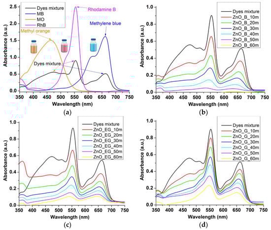 Absorption spectra for individual dyes, methylene blue (MB), Rhodamine B (RhB) and methyl orange (MO) and for dyes mixture (MB + RhB + MO), with indication of the corresponding absorption maxima (a); photocatalytic activity of ZnO_B sample against dyes mixture (b); photocatalytic activity of ZnO_EG sample against dyes mixture (c); photocatalytic activity of ZnO_G sample against dyes mixture (d).
