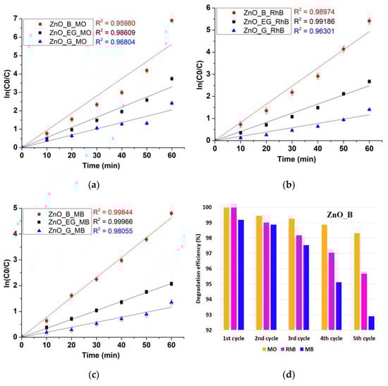 Determination of kapp by plotting ln(C0/C) vs time for each dye from the MO + RhB + MB mixture: MO (a); RhB (b); MB (c); degradation efficiency for ZnO_B sample over five photocatalytic cycles against MO + RhB + MB mixture (d).