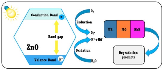 All three ZnO samples have a good degradation efficiency under visible light irradiation, exhibiting strong photocatalytic activity against all three dyes in the mixture. The proposed photocatalytic degradation mechanism implies the generation of ROS and is depicted in Figure 11.