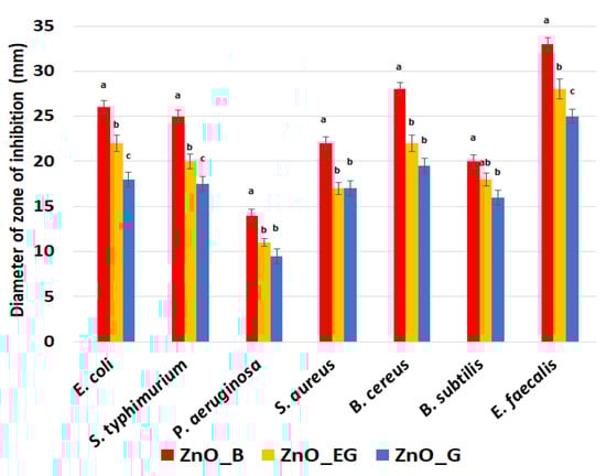 To confirm the potential antibacterial activity of the ZnO NPs, the evaluation of the zone of inhibition of growth was firstly employed. The ZnO NPs present a different antibacterial effect, depending on the tested strain and nanoparticles size. We utilized Gram-negative strains (E. coli; S. typhimurium; P. aeruginosa) and -positive strains (S. aureus; B. cereus; B. subtilis; E. faecalis), relevant in water-borne infections, in order to highlight the antibacterial spectrum of the obtained ZnO NPs. The obtained results, shown in Figure 12, indicate that the bacterial growth inhibition zone is influenced by the size of the nanoparticles for all the samples.