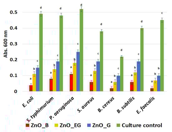Graphic representation of average absorbance at 600 nm revealing growth of planktonic bacterial cultures in the presence of control and ZnO NPs for 24 h at 37 °C. Different small letters (a–d) indicate statistically significant differences between films (p < 0.05).