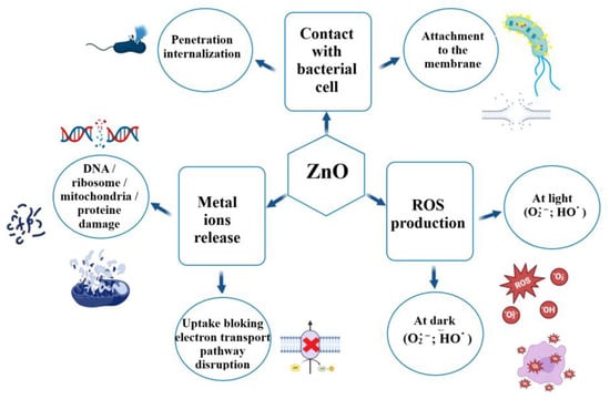 Pathogenic bacteria represent a critical threat for health worldwide, and the resistance to the antibiotics is becoming a serious problem. Alternative fighting methods include the use of non-traditional antimicrobials, such as nanoparticles or plant extracts. ZnO can be considered as a nano-antibiotic, with a strong action against pathogenic microorganisms. The antimicrobial mechanisms reported by the literature are based on ROS production under UV or visible light irradiation, but are also dependent on the size and morphology of the nanoparticles [,]. Figure 14 depicts the multiple pathways described by the literature: ROS production, direct damage inflicted by nanoparticles to the microorganisms’ membrane or release of Zn2+ ions that can interact with cellular constituents [,,].