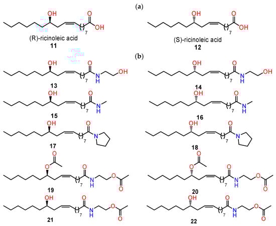 - Matysiak, S.; Chmiel, A.; Skolimowski, J.; Kula, J.; Pasternak, B.; Blaszczyk, A. Synthesis and cytotoxicity of (R)- and (S)-ricinoleic acid amides and their acetates. Chirality 2017, 29, 616–622. [Google Scholar] [CrossRef]
