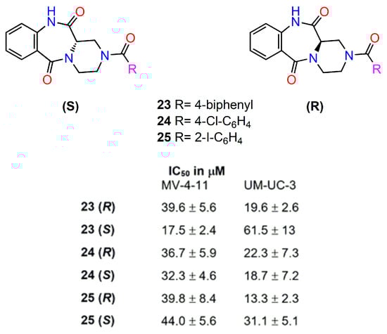 - Mieczkowski, A.; Psurski, M.; Bagiński, M.; Bieszczad, B.; Mroczkowska, M.; Wilczek, M.; Czajkowska, J.; Trzybiński, D.; Woźniak, K.; Wietrzyk, J. Novel (S)-1,3,4,12a-tetrahydropyrazino[2,1-c][1,4]benzodiazepine-6,12(2H,11H)-dione derivatives: Selective inhibition of MV-4-11 biphenotypic B myelomonocytic leukemia cells’ growth is accompanied by reactive oxygen species overproduction and apoptosis. Bioorg. Med. Chem. Lett. 2018, 28, 618–625. [Google Scholar] [CrossRef]