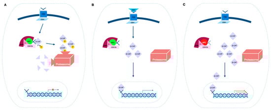 In patients with FAP, a loss of function APC mutation will directly influence the WNT signaling pathway; when the proliferation signal mediated by WNT is absent, β-catenin is phosphorylated, bound to the “destruction complex”, namely a protein assembly made up of APC, axin (a cytosolic scaffold protein), conductin (a protein that phosphorylates serine and threonine residues of centrosomes) [] and glycogen synthase kinase 3 b (GSK3b), and eventually degraded by proteasomes. On the other hand, when WNT binds the frizzled receptor, it activates a different protein cascade, which ends with GSK3b being inactivated []. Therefore, β-catenin is no longer destroyed and cells receive a proliferation signal; once stabilized, β-catenin migrates to the nucleus, where it acts as a transcriptional activator: it provides an uncontrolled permanent mitogenic signal, through the interaction with DNA-binding proteins (Figure 1) [].