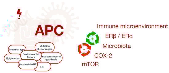 Familial adenomatous polyposis (FAP) is a hereditary cancer syndrome characterized by the presence of hundreds to thousands of synchronous polyps in the gastrointestinal tract, especially in the large intestine []. When untreated or undiagnosed, colorectal polyps will ultimately progress into colorectal cancer (CRC) when the patient reaches approximately 40 years of age []. Colorectal cancer remains a significant global health burden, representing the third most common diagnosed cancer in both sexes, although the sporadic form is steadily declining, presumably due to increased screening programs and the reduction of lifestyle risk factors in the general population [,]. Indeed, alcohol consumption, poor physical activity, obesity, high percentage of visceral fat and diet rich in red meat and poor in fibers are the main risk factors that are the most impactful on CRC prevalence worldwide, even in low-income and middle-income areas due to the process of Westernization []. Around 20% of patients have a positive family history, with at least one close relative (first- or second-degree relative) with a previous CRC diagnosis, showing nonsyndromic familial aggregation []. Instead, hereditary syndromes with a Mendelian inherited causative gene represent 5% of all CRC cases, among which FAP accounts for <1% []. Therefore, we performed a narrative review, whose scope was to explore the genetic and environmental factors that may contribute to the development of CRC in FAP.