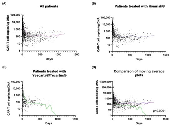CAR T-cell dynamics in the PB in patients included in the study: (A) in the entire patient cohort; (B) in patients treated with Kymriah®; (C) in patients treated with Yescarta®/Tecartus®; (D) Comparison of moving average plots from A, B and C. Violet: average line for all patients; blue: average line for patients treated with Kymriah®; green: average line for patients treated with Yescarta®/Tecartus®.