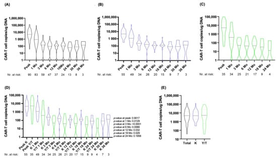 CAR-T cell construct concentrations in the PB at 1, 3, 6, 12, 18, 24, 30 and 36 months post-treatment. (A) in the entire patient cohort; (B) in patients treated with Kymriah®; (C) in patients treated with Yescarta®/Tecartus®; (D) comparison between the Kymriah® vs. Yescarta®/Tecartus® cohorts; (E) Comparison of CAR T-cell peak levels between all patients vs. Kymriah® cohort vs. Yesarta®/Tecartus® cohort; Grey dashed line: Quartiles; Black dashed line: Median; Abbreviations: K: Kymriah®; Mo: month(s); T: Tecartus®; Y: Yescarta®. Black: all patients; blue: patients treated with Kymriah®; green: patients treated with Yescarta®/Tecartus®.