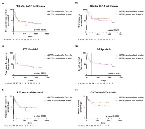 Clinical outcomes in patients with detectable vs. non-detectable CAR T-cells by ddPCR in the PB at 6 months post-CAR T-cell treatment (A) PFS in the entire cohort; (B) OS in the entire cohort; (C) PFS in patients treated with Kymriah®; (D) OS in patients treated with Kymriah®; (E) PFS in patients treated with Yescarta®/Tecartus®; (F) OS in patients treated with Yescarta®/Tecartus®. Abbreviations: OS: overall survival: PFS: progression-free survival. Orange: patients with negative ddPCR for CAR-T constructs in PB at 6 months; pink: patients with positive ddPCR for CAR-T constructs in PB at 6 months.