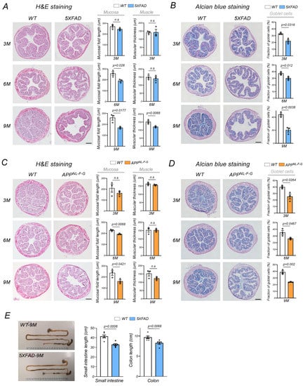 From H&E staining, age-dependent decreases in the cross-sectional length of colon mucosal folds were identified in 5XFAD mice relative to age-matched WT controls (Figure 1A). While colon muscular thickness was similar between all mice at 3- and 6-months-old, significant decreases in thickness were observed in 9-month-old 5XFAD animals (Figure 1A). Using Alcian blue staining, we consistently observed age-dependent intestinal content loss in 5XFAD mice when compared with age-matched WT controls. Alcian blue-stained goblet cell fractions were progressively shortened in 5XFAD mouse colons and showed approximately 50% loss at 9-months-old (Figure 1B), which is consistent with goblet cell degeneration in human AD gut tissues [37]. To exclude the possibility that enteric network density loss was caused by APP overexpression in 5XFAD mice, we examined colon structures in APPNL-F-G knock-in (KI) mice which expressed human AD mutations at a humanized mouse APP locus; mutations were driven by the APP endogenous promoter, therefore animals developed neurocognitive defects and amyloid plaques [38]. This KI construct had a humanized Aβ region and three pathogenic Swedish “NL”, Iberian “F”, and Arctic “G” mutations [38]. Mice expressed endogenous APP levels and avoided possible artifacts mediated by APP overexpression while simultaneously generating increased pathogenic Aβ levels [38]. In our study, these KI mice exhibited age-dependent colon mucosal fold and goblet cell degeneration, with severe loss at 9-months-old (Figure 1C,D). Additionally, the overall small intestine and colon length in 5XFAD mice was significantly shorter when compared with age-matched WT controls (Figure 1E). Collectively, we observed age-dependent intestinal tissue degeneration in APP-associated mouse AD models.