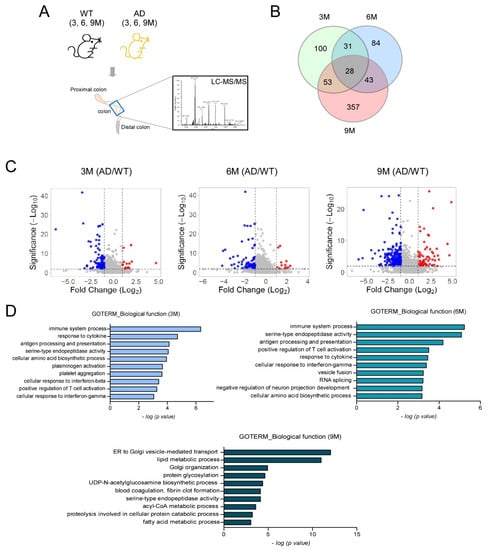 Colonic protein profiling alterations in AD mice over time. Colons were harvested from 5XFAD and WT mice at 3, 6, and 9 months and label free LC-MS/MS analyses were performed. (A) Proteomics analysis scheme. (B) The Venn diagram shows the proteins that were altered in 5XFAD colons over time (5XFAD/WT: 0.5 ≥ fold change ≥ 2). (C) Volcano plots represent significantly altered proteins (blue = down-regulated and red = up-regulated) in 5XFAD mice at 3, 6, and 9 months (5XFAD/WT: 0.5 ≥ fold change ≥ 2, unpaired t-test). (D) Gene Ontology biological process pathway analyses on altered proteins in 5XFAD mouse colons at 3, 6, and 9 months (Fischer’s exact test, p < 0.01). The top 10 pathways at each time point are shown.