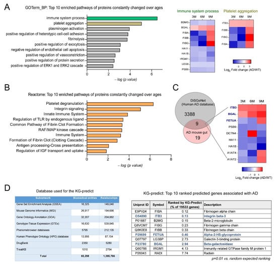 Tracking colonic proteins associated with AD concomitant with disease progression. From our cross-sectional study (3, 6, and 9 months), we analyzed 28 proteins which were consistently changed in 5XFAD mouse colons. (A) Top 10 pathways using gene ontology biological process analysis. Fischer’s exact test, p < 0.01. Right panel: altered proteins enriched in “immune system processes” and “platelet aggregation”. (B) Top 10 pathways from Reactome analysis. Fischer’s exact test, p < 0.01. (C) The Venn diagram shows overlaps between DiSGeNET’s AD and gene-disease association dataset (#C0002395) and proteins consistently altered in 5XFAD mouse colons over time. The heat map shows nine overlapped proteins that were altered in 5XFAD mouse colons over time. (D) Artificial intelligence-based KG prediction framework was used to predict the association of 28 consistently altered proteins in 5XFAD mouse colons with AD. Left: the table shows database construction which was used for KG predictions. Right: the table shows the top 10 ranked proteins associating with AD. KG predictions confirmed proteins which were known to associate with AD, and also predicted new proteins potentially associating with AD; ITGB3, PETUA, and BGAL (blue) are three proteins overlapping from C and D analyses.