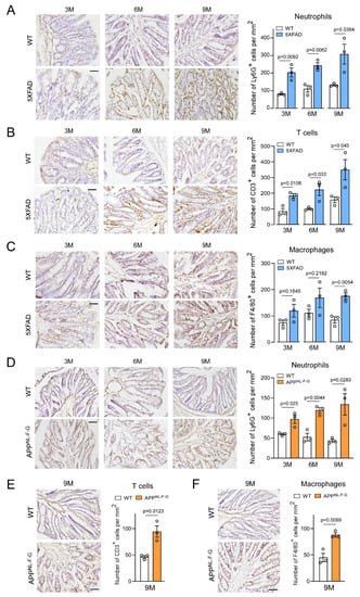Our cross-sectional proteomic analysis of 5XFAD mouse colons suggested that proteins enriched in immune response were mostly affected across different ages (Figure 3). We next examined if immune changes were associated with intestinal pathology in 5XFAD mice. 5XFAD and WT mouse colonic sections (all ages) were stained using anti-Ly6G (neutrophil marker), anti-CD3 (T cell marker), and anti-F4/80 (macrophage marker) antibodies. IHC analyses identified age-dependent increases in cells immune-positive for anti-Ly6G, CD3, or F4/80 antibodies in 5XFAD colon tissues starting at 3 months when compared with age-matched WT controls (Figure 4A–C). Age-dependent increases in Ly6G+, CD3+, and F4/80+ cells were consistently observed in APPNL-F-G KI mouse colons (Figure 4D–F). Thus, inflammatory cell infiltration and accumulation, including neutrophils, T cells, and macrophages, had occurred in AD mouse colons, concomitant with intestinal tissue degeneration and AD progression. These findings in our mouse models were consistent with the observations that inflammatory cells were increased in human AD gut tissues [37], which may lead to gut barrier dysfunction [8]. Importantly, these findings supported our proteomic analyses showing that altered immune phenotypes characterized intestinal tissue in AD mice.