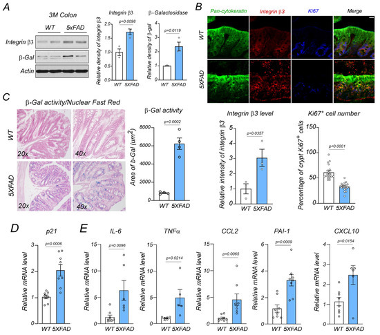 Both p21- and p16-induced levels robustly reflect cell senescence [19,21]. In our study, p21 mRNA levels were significantly increased in 5XFAD mouse colons when compared with WT controls (Figure 5D), suggesting p21-dependent senescent events. Additionally, cytokines implicated in SASPs, including interleukin-6 (IL-6), tumor necrosis factor-α (TNF-α), C-C Motif Chemokine Ligand 2 (CCL2), plasminogen activator inhibitor-1 (PAI-1), and C-X-C motif chemokine ligand 10 (CXCL10) were significantly induced in 5XFAD mouse colonic tissue when compared with WT controls (Figure 5E). Collectively, strong cell senescence signatures were identified in 5XFAD mouse colons and were associated with increased integrin β3 levels in the epithelium.