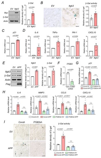 Integrin β3 mediates APP-induced colonic senescence. (A) Total protein lysates were harvested from HCT116 cells overexpressing an empty Myc vector (EV) or a Myc-tagged integrin β3 (Itgb3) vector and subjected to western blotting. Representative immunoblots of three independent experiments are shown. Relative β-galactosidase (β-gal) density was quantified. (B) Senescence associated β-galactosidase (SA-β-gal) activity was assessed after 48-h overexpression of EV or the Itgb3 vector in HCT116 cells. Representative images of six independent experiments are shown (Scale bar = 25 μm). SA-β-gal activity is indicated by arrow. (C) p21- and (D)-senescence associated secretory phenotype-related mRNA levels for IL-6, TNFα, PAI-1, and CXCL-10 via a RT-qPCR after the 48-h overexpression of EV or the Itgb3 vector in HCT116 cells. (E) Total protein lysates were harvested from HCT116 cells overexpressing the empty flag vector (EV) or a flag-tagged amyloid precursor protein (APP) vector and subjected to western blotting. Representative immunoblots of three independent experiments are shown. (F) HCT116 cells stably expressed ITGB3 (short hairpin RNA), shRNA (ITGB3sh), or control shRNA (Consh). ITGB3 mRNA levels were measured via a RT-qPCR to confirm knock-down efficiency. Consh or ITGB3sh HCT116 cells were transfected with the APP vector or EV for 48 h, (G) p21- and (H) SASP-related mRNA levels for IL-6, CXCL-10, MMP3 (Matrix Metalloproteinse 3), and CCL5 via a RT-qPCR. (I) SA-β-gal activity (indicated by arrow) was assessed in indicated groups (scale bar = 25 μm). Data were expressed as the mean ± standard error of the mean and compared using unpaired Student’s t-tests (A–F) and one-way analysis of variance (G–I). n.s: no significance.