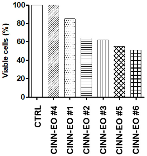 Dose–response effect of six different C. zeylanicum essential oils (CINN-EOs). All the CINN-EOs were used at the concentration of 10 µg/mL on M14 cells for 48 h. The number of viable cells after each treatment is reported as a percentage of the untreated control cells.
