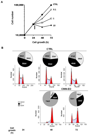 Anti-proliferative effect of CINN-EO on M14 melanoma cells. (A) Dose–response curves for CINN-EO at the indicated oil concentrations (µg/mL). CTRL, untreated cells. The values are the mean ± SD of at least three experiments. The standard deviations, when not evident, are comprised in symbols. The arrow indicates the start of CINN-EO treatment. (B) Effect of CINN-EO on the cell-cycle phase distribution of the M14 melanoma cell line. Cells were exposed to 10 µg/mL CINN-EO for the indicated times. Untreated (CTRL) and treated cells were then stained with PI and analysed for DNA content by flow cytometry. The percentages ± SDs of cells in the G0/G1 (light grey), S (black) and G2/M (dark grey) phases of the cell cycle were estimated from each histogram with ModFit software. The histograms shown are representative ModFit analyses for each condition from at least three different experiments with similar results. The number reported in each panel represents the time of treatment (h).
