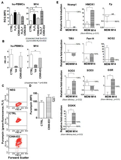 CINN-EO affects intracellular oxidative and iron metabolism. (A) ROS production in M14 cells and hu-PBMCs. (B) Mitochondrial membrane potential (mt-ΔΦ) in M14 cells and hu-PBMCs. (C) Representative cytograms of puromycin induction after CINN-EO treatment in M14 cells. CTRL, untreated cells; CINN-EO, treated cells. (D) Puromycin mean fluorescence intensity (MFI), as evaluated by FACS and normalised to the cell protein content, indicating the intracellular iron(II) amount after CINN-EO treatment. The results are the average of three independent experiments. (E) Gene expression in MDMs and M14 cells upon CINN-EO treatment (* p < 0.05; nd, not detected). Relative fold-induction were calculated versus control MDM.