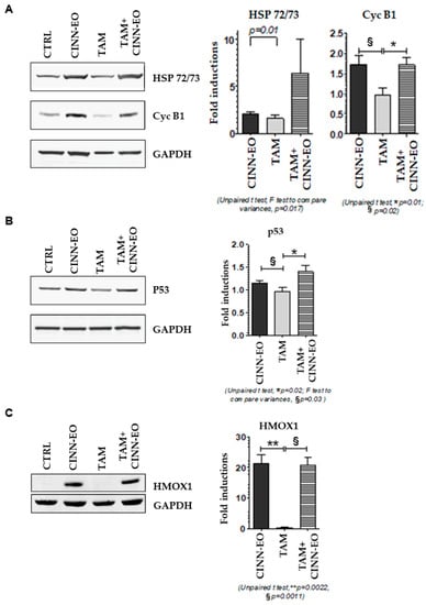 Effects of CINN-EO alone or in combination with TAM on the expression of the indicated proteins. (A) HSP72/73 (upper) and Cyclin B1 (middle) protein expression fold-induction vs. Ctrl (right); corresponding representative blots are shown (left). (B) p53 protein expression fold-induction vs. Ctrl (right) and corresponding representative blots (left). (C) HMOX1 protein expression fold-induction vs. Ctrl (right) and corresponding representative blots (left). GAPDH expression was used as a protein loading control in each blot. Fold-inductions are calculated for each protein versus the untreated CTRL.