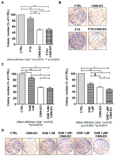 M14 cells were exposed to 10 µg/mL C. zeylanicum EO alone or in combination with (Z)-4-Hydroxytamoxifen (Sigma-Aldrich, #H7904; TAM) at a concentration of 0.1 µM in ethanol, paclitaxel (Sigma-Aldrich, #T7402; PTX) at a concentration of 10 nM in DMSO, and dabrafenib (Selleck Chemicals, Houston, TX, USA; #GSK2118436; DAB) at concentrations of 1 nM and 1 µM in DMSO for 24 h. The drug doses employed were chosen by performing dose–response experiments on M14 cells using different doses in each case: TAM (0.1, 1, and 10 µM); PTX (10, 30, and 100 nM); and DAB (0.1, 1, 10, 100, and 1000 nM). The lowest TAM (0.1 µM) and PTX (10 nM) were used in the combination treatment experiments since they did not elicit any toxic effect on M14 cells. One very low and the highest DAB doses were chosen as M14 cells appear to be relatively resistant to this drug (Figure S3). In each case, adherent cells were harvested after treatment and seeded at clonal density (1000 cells/dish) in 35 mm Petri dishes. Fifteen days after seeding, a solution of 2% methylene blue in 95% ethanol was added to the monolayer for at least 30 min. The dishes were then washed with ddH2O, and the colonies (at least 50 cells) were counted. The results are expressed as the plating efficiency (percentage of colonies formed from the number of cells seeded). The percentage of cell survival was calculated as the % survival of control cells.