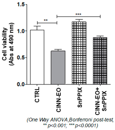 M14 cell metabolic activity and proliferation were determined with CellTiter 96® Aqueous One Solution Reagent from a cell proliferation colorimetric assay (Promega, Madison, WI, USA) upon CINN-EO administration and with or without tin protoporphyrin IX (SnPPIX), a well-characterised HMOX-1 enzymatic inhibitor. Melanoma cells were incubated with 10 µg/mL CINN-EO alone or in combination with 5 µM SnPPIX for 24 h. As a control, cells were also incubated with 5 µM SnPPIX alone. After treatment, the cells were incubated with 100 mL/mL MTS, the tetrazolium compound 3-(4,5-dimethylthiazol-2-yl)-5-(3-carboxymethoxyphenyl)-2-(4-sulfophenyl)-2H-tetrazolium on which this assay is based, and an electron-coupling reagent (phenazine methosulfate) at 37 °C for approximately 1 h. Metabolically active cells reduced MTS into a soluble formazan product, the absorbance of which was measured at 490 nm in growth medium. The background absorbance of the medium-only control was subtracted from the absorbance of the collected samples.