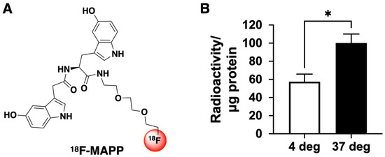 We have previously demonstrated that 18F-MAPP can cross the blood–brain barrier (BBB) in vivo [17]. However, it was unknown whether 18F-MAPP can penetrate the cell membrane to detect intracellular MPO activity. To determine whether 18F-MAPP can penetrate the cell membrane, we incubated neutrophils from mouse bone marrow with 18F-MAPP for 1 h at 37 °C and 4 °C followed by washing to remove 18F-MAPP that had not entered into the cells. We found radioactivity in the cellular fractions at both 4 °C and 37 °C, revealing that the 18F-MAPP was able to enter into the cells at both temperatures (Figure 1B). Interestingly, 18F-MAPP cellular uptake at 37 °C was significantly higher than that at 4 °C, suggesting that 18F-MAPP cellular entry may have an energy-dependent mechanism in addition to passive diffusion.