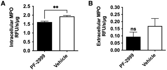 MPO activity assay with mice treated with 15 mg/kg of PF-2999. (A) Intracellular MPO activity in mice treated with PF-2999 was significantly lower compared to that in the control group (** p < 0.01, n = 4 for each group, one-tailed t-test). (B) Extracellular MPO activity in mice treated with PF-2999 showed 38% reduction compared to that in the control group (ns = not significant, p = 0.17, n = 4 for each group, one-tailed t-test).