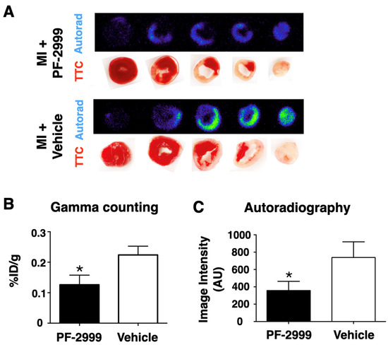 To corroborate the imaging results, hearts from mice receiving 50 mg/kg of PF-2999 and vehicle were harvested after imaging. The heart tissue slices (1 mm) were subjected to gamma counting and autoradiography (Figure 4). Since PF-2999 treatment was administered after MI when irreversible ischemic tissue damage had already occurred, the triphenyltetrazolium chloride (TTC) staining of the heart slices demonstrated similar sizes of the infarcted tissue between PF-2999-treated mice and control mice (Figure 4A). However, the radioactivity was significantly lower in the heart slices from PF-2999-treated mice compared to those treated with vehicle. The total radioactivity of the heart slices in mice treated with PF-2999 demonstrated a 44% reduction compared to that in control mice (Figure 4B, p = 0.024, one-tailed t-test). This was matched by a similar reduction on autoradiography that showed a 51% reduction in PF-2999-treated MI mice compared to those treated with vehicle (Figure 4C, p < 0.05, one-tailed t-test). These ex vivo measurements correlated well to the imaging data (40% reduction), confirming the ability of 18F-MAPP imaging to report the pharmacological changes of MPO inhibition in vivo.