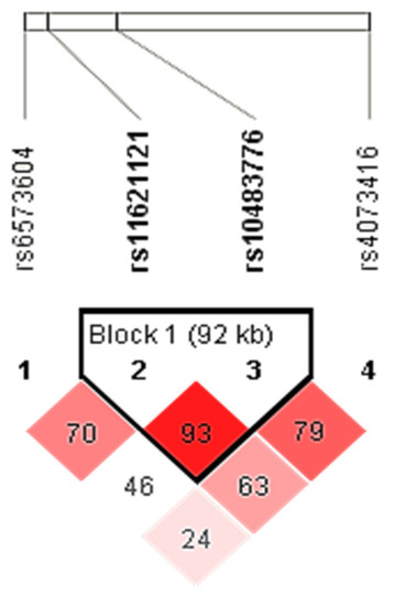 Haplotype analysis showed a weak linkage disequilibrium (LD) between all four tested polymorphisms (D′ × 100 = 24); however, the rs11621121 and rs10483776 polymorphisms were in a strong LD (D′ × 100 = 93) (Figure 1). Therefore, the haplotypes for the rs11621121 and rs10483776 polymorphism block were determined for each subject using an expectation–maximization algorithm. The most common was the TA haplotype, which was represented in more than half of the subjects (55.5%), followed by the CA (25.9%) and the CG (21.6%) haplotypes. The rarest was the TG haplotype (0.5%), which was excluded from further analysis due to its low frequency (<1%).