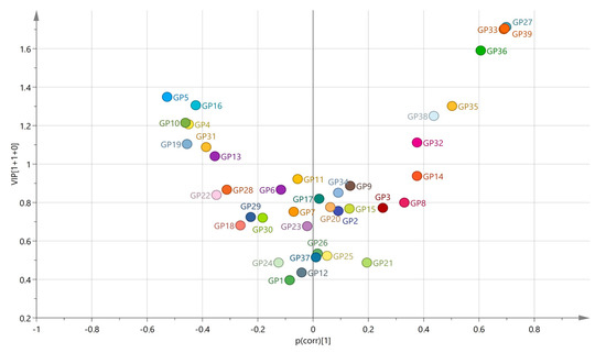 Volcano plot plotting the variable importance in the projection (VIP), acquired in the OPLS-DA model, against the correlation coefficient values (p(corr)) for all included variables between the PTSD patients and the control participants. Colored according to the identifiers.