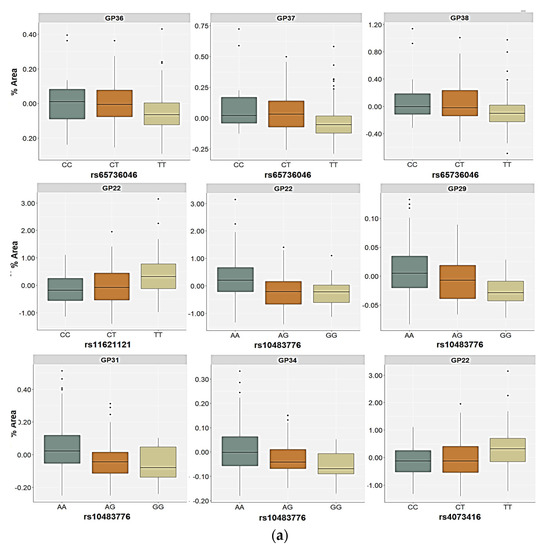 The differences in the relative abundance of the N-glycan peaks in the participants subdivided according to different the rs6573604, rs11621121, rs10483776, and rs4073416 genotypes (genetic model) or alleles (allelic model) were evaluated using the Kruskal–Wallis ANOVA on ranks with the post hoc Dunn test and the Mann–Whitney U test, respectively. The FDR (Benjamini–Hochberg) method was used to correct the p-values for the number of tested N-glycan species. The corrected values of pBH < 0.05 were considered significant.
