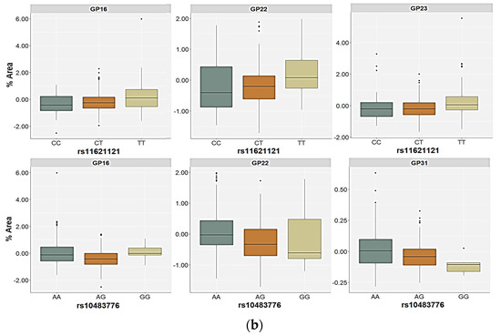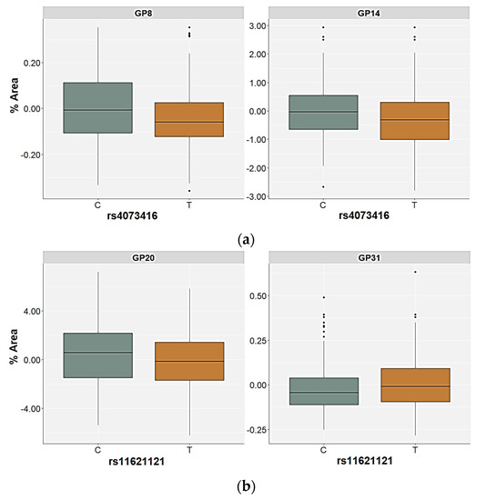 Relative distribution of the plasma N-glycan levels in the carriers of different alleles for (a) the rs4073416 polymorphism in the control group and (b) the rs11621121 polymorphism in the PTSD group. The central box represents the interquartile range of the age-adjusted percentage of the total glycan peak area, the middle line represents the median, the vertical line extends from the minimum to the maximum value, and separate dots represent the outliers.