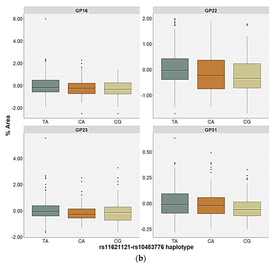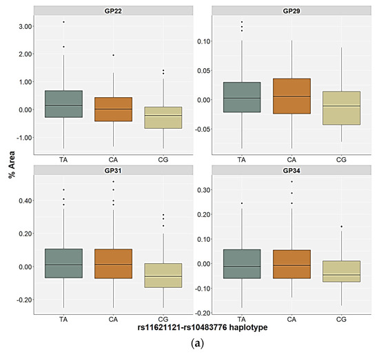 Relative distribution of the plasma N-glycan levels in the carriers of the different rs11621121–rs10483776 haplotypes in the (a) control and (b) PTSD group. The central box represents the interquartile range of the age-adjusted percentage of the total glycan peak area, the middle line represents the median, the vertical line extends from the minimum to the maximum value, and separate dots represent the outliers.