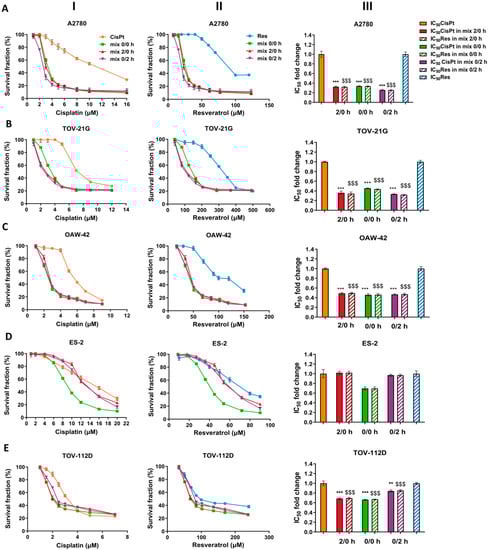 Effects of cisplatin, resveratrol, and combinations of the two drugs on OC cell line viability, estimated by alamarBlue assay. The human ovarian cancer cells were treated with cisplatin (CisPt) alone, resveratrol (Res) alone, and their combination (CisPt+Res) at a constant ratio (IC50′s ratio CisPt:Res) for 72 h. For combination studies, three different cell treatment protocols were used: both compounds were added at the same time (mix 0/0 h), Res given 2 h before CisPt (mix 2/0 h), or given 2 h after CisPt (mix 0/2 h). Survival curves of (A) A2780; (B) TOV-21G; (C) OAW-42; (D) ES-2; (E) TOV-112 cell lines; (I) CisPt alone vs. CisPt+Res; and (II) Res alone vs. CisPt+Res; (III) Changes of IC50 doses of CisPt and Res in mixes 2/0 h, 0/0 h, and 0/2 h, respectively. The results of three experiments are presented as mean ± SD. Statistically significant (Student’s t-test and Mann–Whitney U test) changes of IC50 in mixes compared to CisPt alone treatment, *** p < 0.001, ** p < 0.01; and $$$ p < 0.001, compared to Res alone treatment.