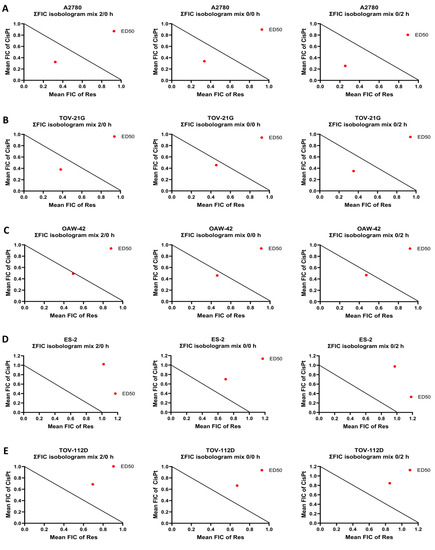 Subsequently, to assess the combinatorial efficacy of CisPt and Res, defined as synergism, additive effect, or antagonism, we generated dose–effect curves, median-effect plots, isobolograms, and combination index (CI) using the CalcuSyn software v.2.0 (Figure 2A–E and Figure S2A–E, Table S3). According to the data summarized in Table S3 and presented in the isobolograms (Figure 2A–E and Figure S2A–E lower panel), the CisPt in combination with Res exhibited the synergism (CI < 1) only in A2780 cells (CI values range, 0.67–0.51 for all protocols). We also noted a moderate synergism to the additive effect (CI = 1) in TOV-21G cells and an additive effect in the OAW-42 cells. The antagonism (CI > 1) occurred in ES-2 and TOV-112D cells.