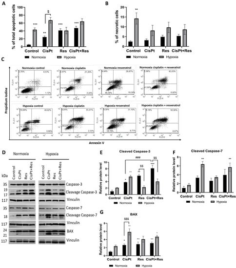 To determine the effect of hypoxia on cell survival (apoptosis and necrosis), we treated A2780 cells with CisPt, Res, or CisPt+Res under normoxic and hypoxic conditions. In normoxia, treatment with CisPt (p = 0.005), Res (p < 0.0001), and CisPt+Res (p < 0.0001) significantly increased apoptosis (Figure 3A,C). Thus, we assessed, by Western blot, the level of expression of selected apoptosis-related proteins. As shown in Figure 3D,E,G, under normoxia, the CisPt significantly upregulated the expression of cleaved caspase-3 (p = 0.034) and BAX (p = 0.02) proteins. Similarly, Res alone significantly increased the levels of cleaved caspase-3 (p = 0.0015) and BAX (p = 0.0085). Res also increased the CisPt-induced cell death (p = 0.0014) and the expression of cleaved caspase-3 (p = 0.003). CisPt+Res significantly increased the level of the caspase-3 (p = 0.036), while the CisPt alone decreased the level of caspase-7 (p = 0.029) (Figure 3D and Figure S3A,B). We also analyzed the percentage of necrotic A2780 cells and observed a slight increase in necrosis in cells treated with CisPt, Res, or CisPt+Res in normoxia (Figure 3B).