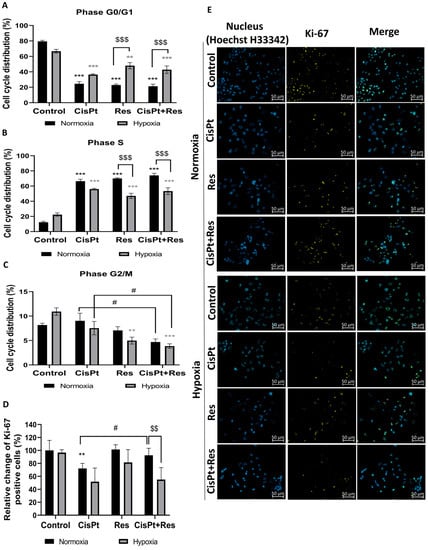 To check the effects of hypoxia on CisPt, Res, and CisPt+Res treatments’ alteration of cell proliferation, we measured the expression of proliferation marker Ki-67. Figure 4D,E shows that cytotoxicity was concomitant with the decrease of Ki-67 level in A2780 cells exposed to CisPt under normoxia (p = 0.0017) and hypoxia (p = 0.0503). Res alone did not affect the Ki-67 level in both oxygen conditions, but reversed CisPt-downregulated proliferation (p = 0.016) only in normoxia. The CisPt-induced decrease in the Ki-67 level persisted after the addition of Res (p = 0.06) under hypoxic conditions.