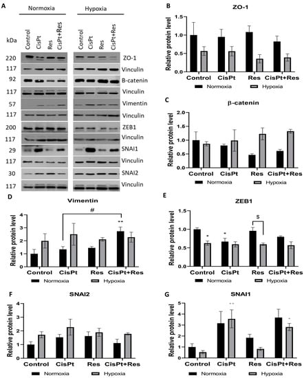 Hypoxia-dependent modifications on EMT markers in A2780 cells upon cisplatin, resveratrol, and in the combination treatments. The cells were treated with cisplatin (CisPt), resveratrol (Res), and the combination (CisPt+Res), according to Section 4.4: Establishment of Hypoxic Culture Conditions and Experimental Outline. (A) Immunoblots of EMT markers; (B–G) densitometric analysis of ZO-1, β-catenin, vimentin, ZEB1, SNAI2 (SLUG), and SNAI1 proteins. Vinculin was used as a loading control and normalized to the normoxia control as 1. Data are expressed as mean values ± SEM of three independent experiments with ** p < 0.01, * p < 0.05, vs. normoxia control (black asterisk) and hypoxia control (grey asterisk); $ p < 0.05, comparing the normoxia group with hypoxia group; and # p < 0.05, CisPt alone vs. CisPt+Res.